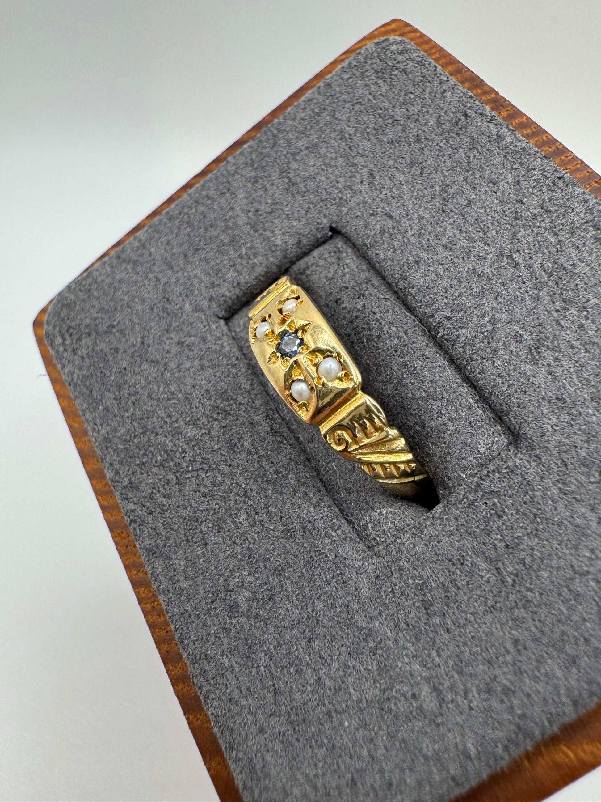 9ct gold sapphire and pearl gypsy ring