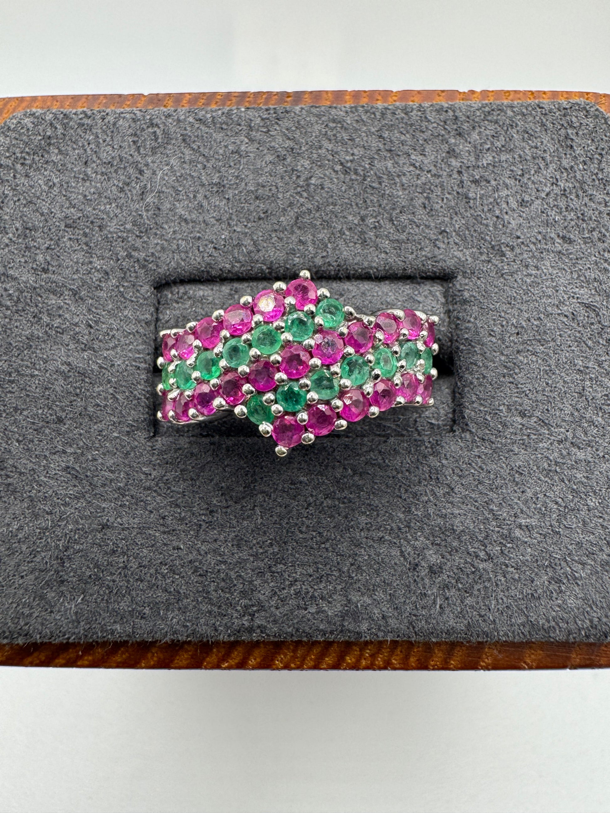 9ct white gold ruby and emerald ring